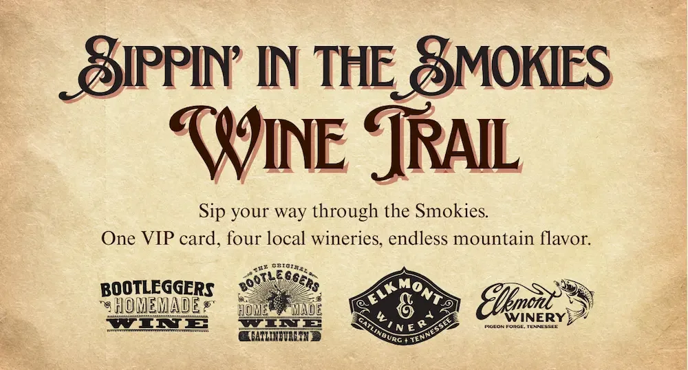 Discover the spirit of the Smokies one sip at a time. The Sippin’ in the Smokies Wine Trail takes you through four locally loved wineries across Gatlinburg and Pigeon Forge — each stop serving up Appalachian flavor, mountain charm, and a good dose of mischief.