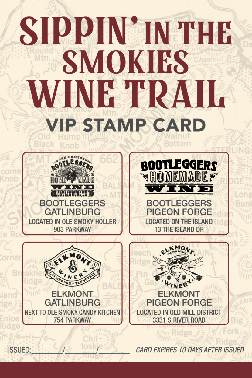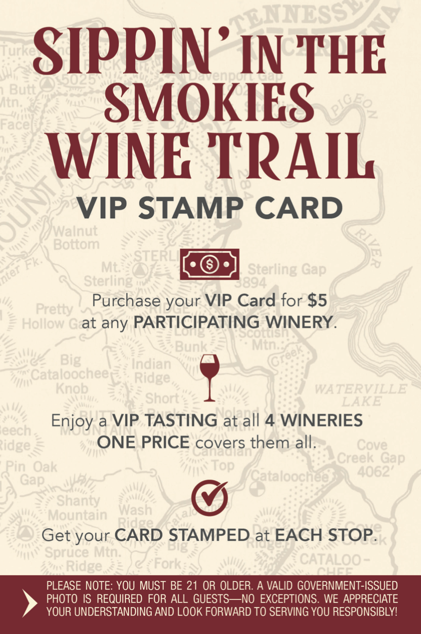 At each stop, get your card stamped and savor the flavors of the Smokies as you make your way along this unforgettable wine adventure.